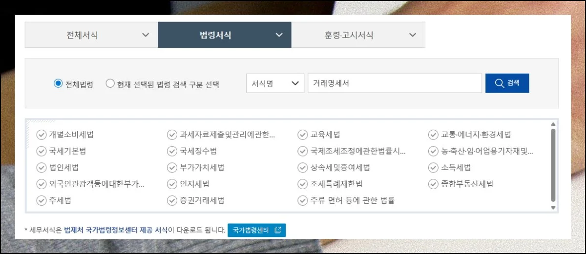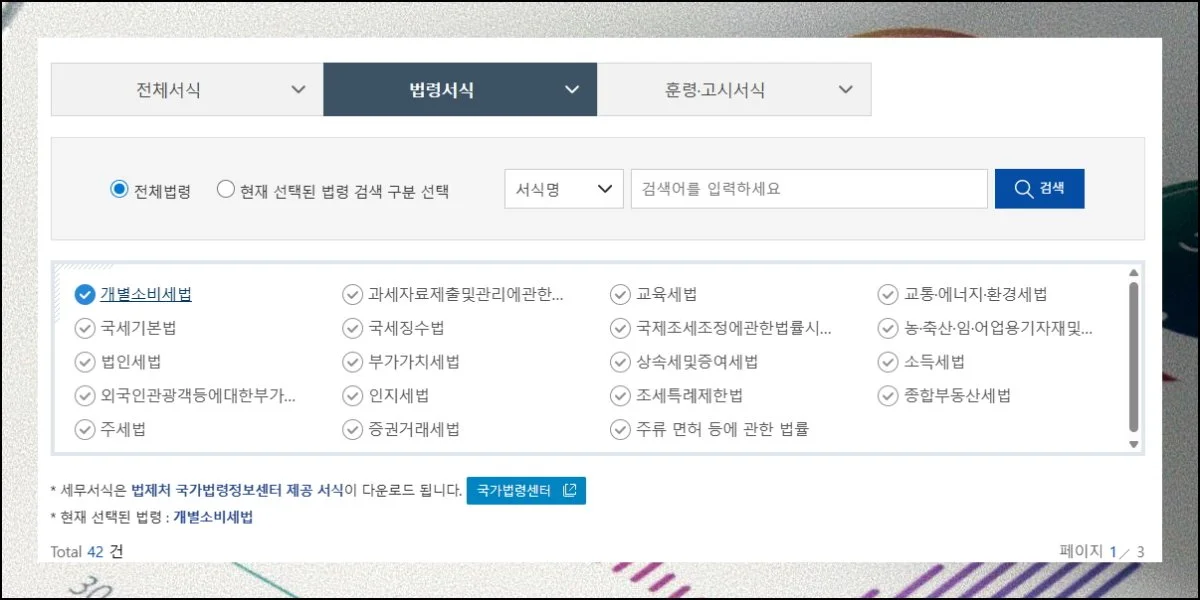 법령서식 화면으로 들어갔다면 이제 원하는 양식 파일을 찾아야 해요. 페이지 위쪽 가운데 부근에 검색 입력란이 보일 겁니다.