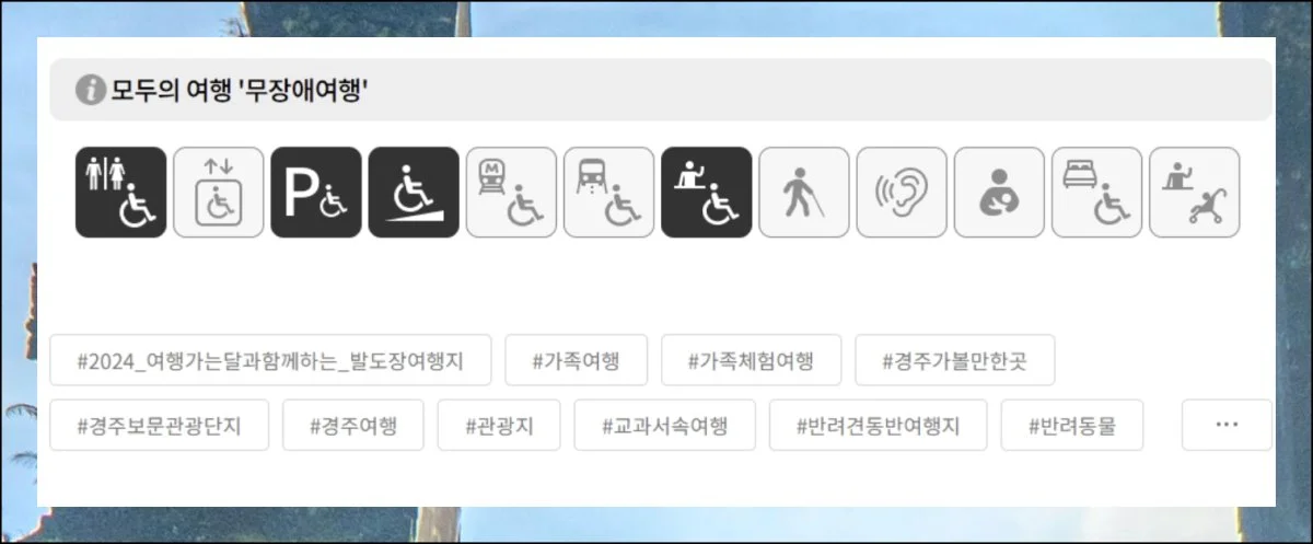 무장애여행 관련 안내도 직관적인 아이콘으로 쉽게 확인할 수 있어요.