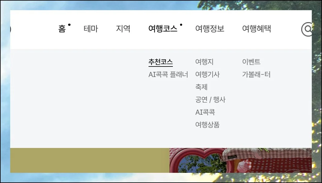 메인 화면에서 여행코스 메뉴에 마우스를 올려놓기만 하면 돼요. 바로 다양한 하위 메뉴가 펼쳐지니까요.