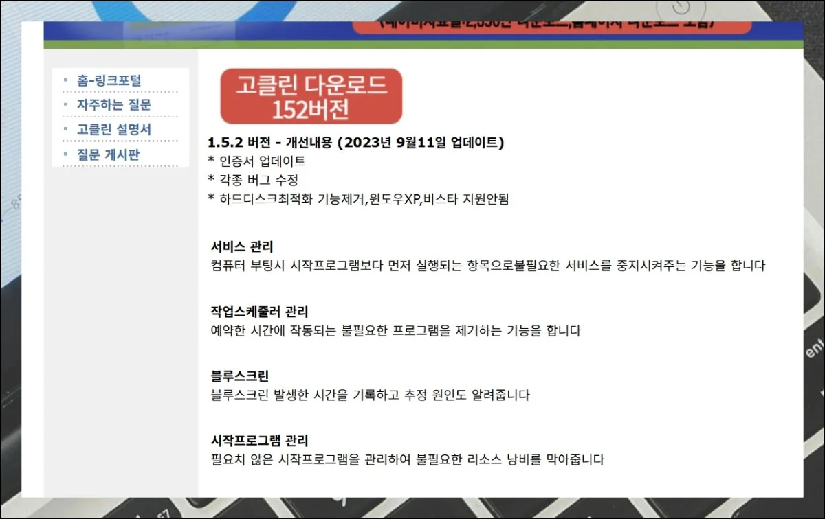 게시판 페이지로 이동하면 고클린 최신 설치 파일을 무료 다운로드 받을 수 있습니다. 이 프로그램으로 할 수 있는 작업들이 간략하게 소개되어 있는데요.