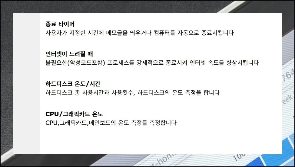 서비스 관리와 작업스케쥴러 관리는 기본이에요. 시작프로그램 관리와 종료 타이머 설정도 가능하죠.