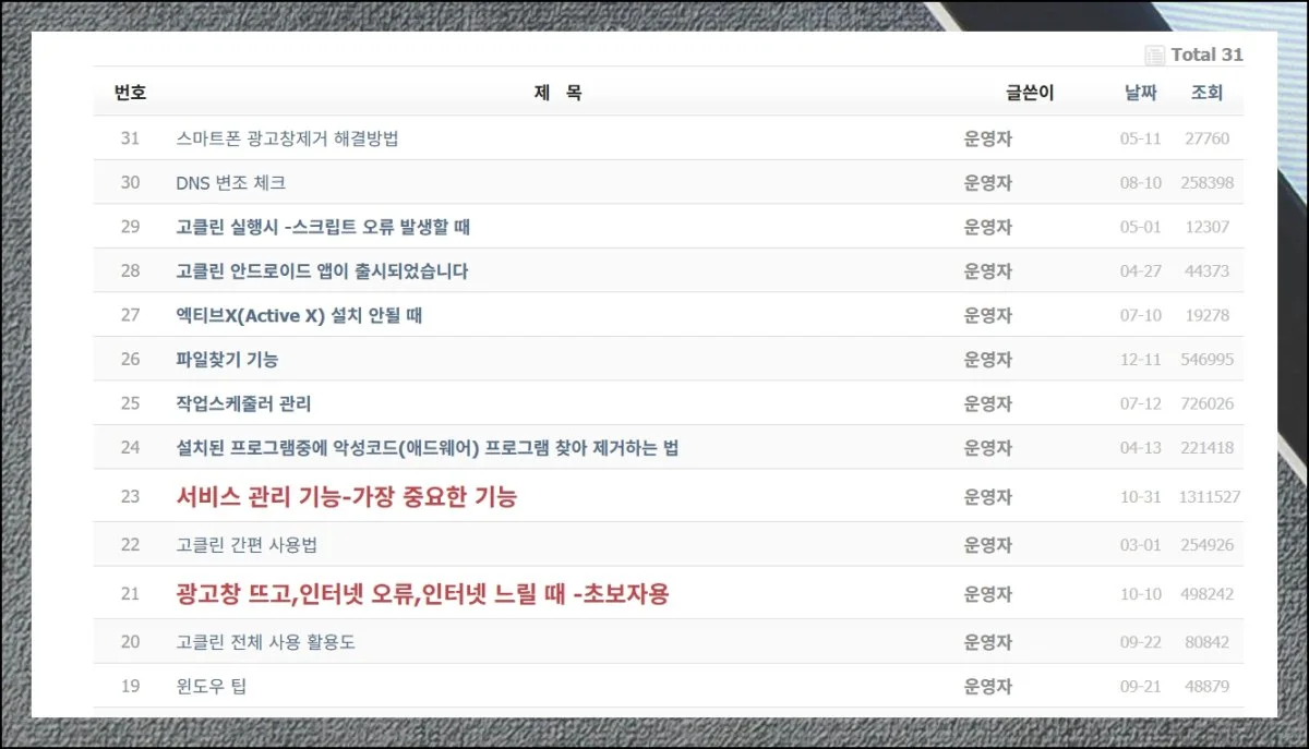 검색창을 기준으로 바로 아래를 보면 고클린 전용 게시판을 쉽게 찾을 수 있습니다.