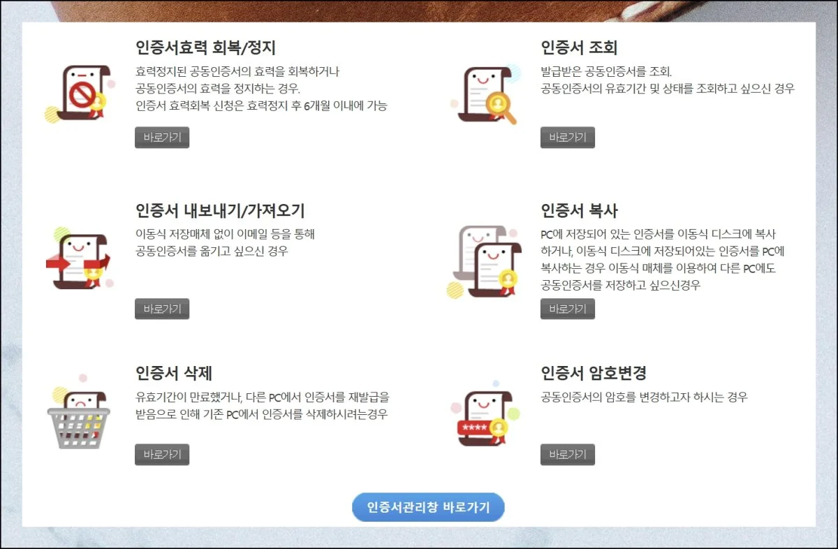 USB로 공인인증서 파일을 옮기는 경우에는 “관리”라고 표시되어 있는 메뉴를 찾아 눌러주세요.