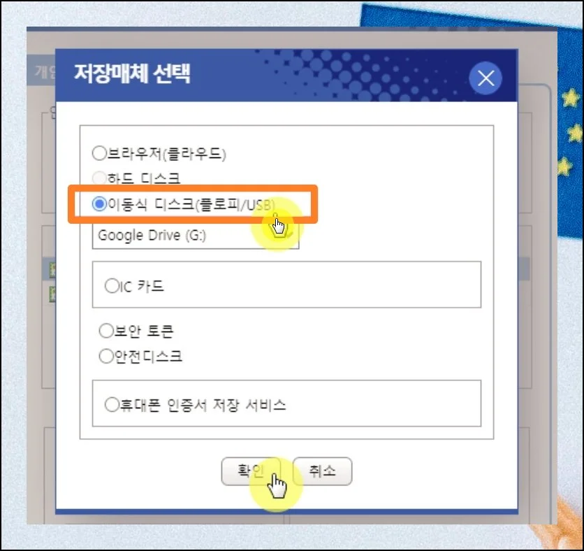 저장할 위치를 고르는 창이 열려요. 이동식 디스크를 지정해주세요. 공인인증서가 바로 이 항목으로 이동됩니다.
