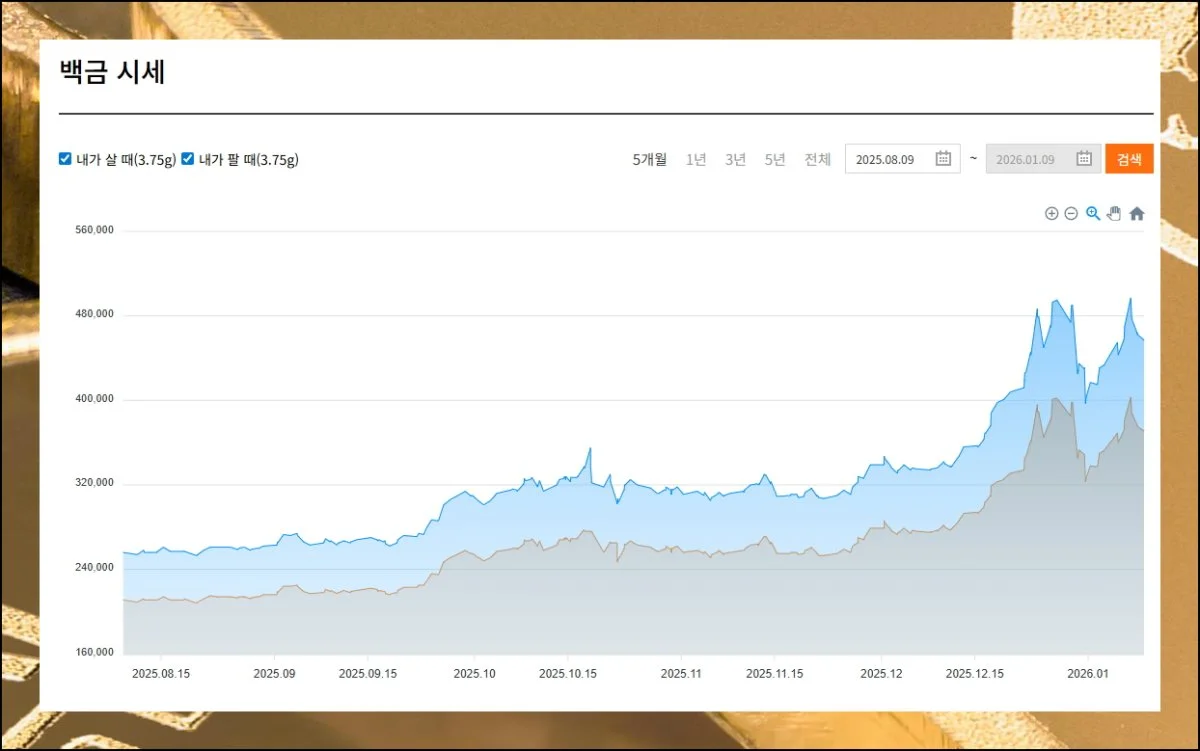 금괴는 주로 순금으로 제작되지만, 한국금거래소에서는 백금 시세도 함께 조회할 수 있습니다.
