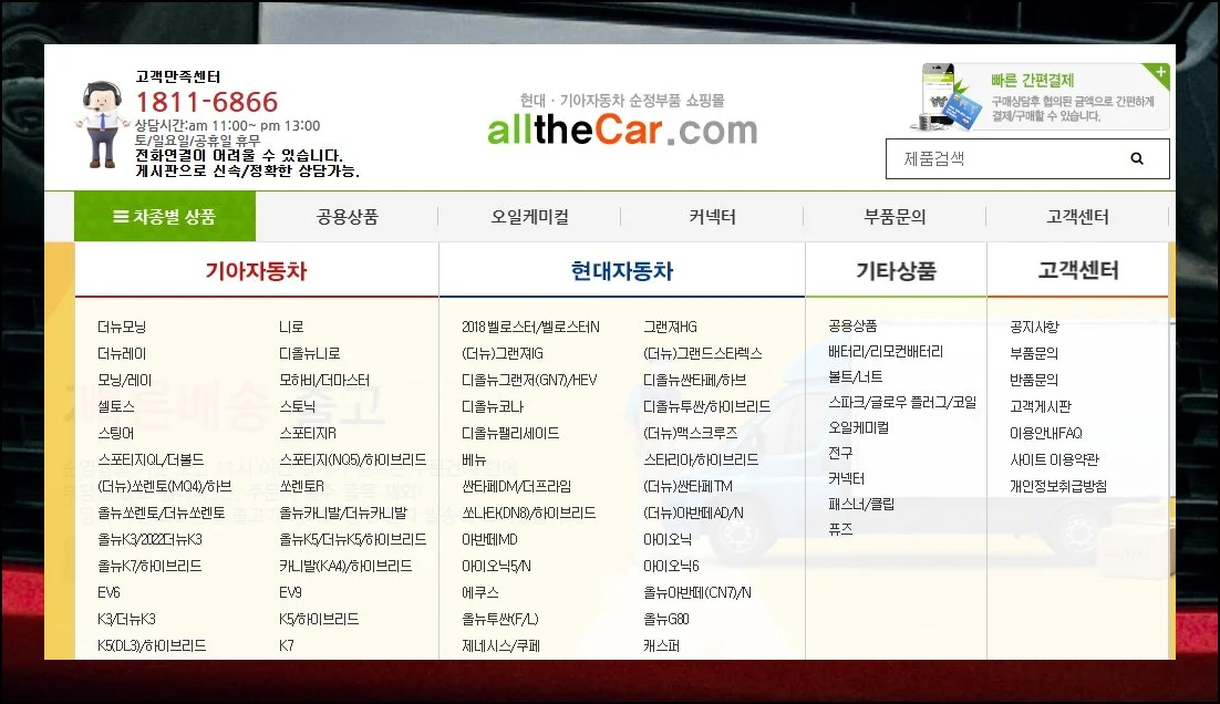 올더카 사이트에서는 니로부터 K7에 이르기까지 전 차종 순정품을 판매해요. 기아자동차의 모든 모델에 해당하는 제품이 마련되어 있습니다.