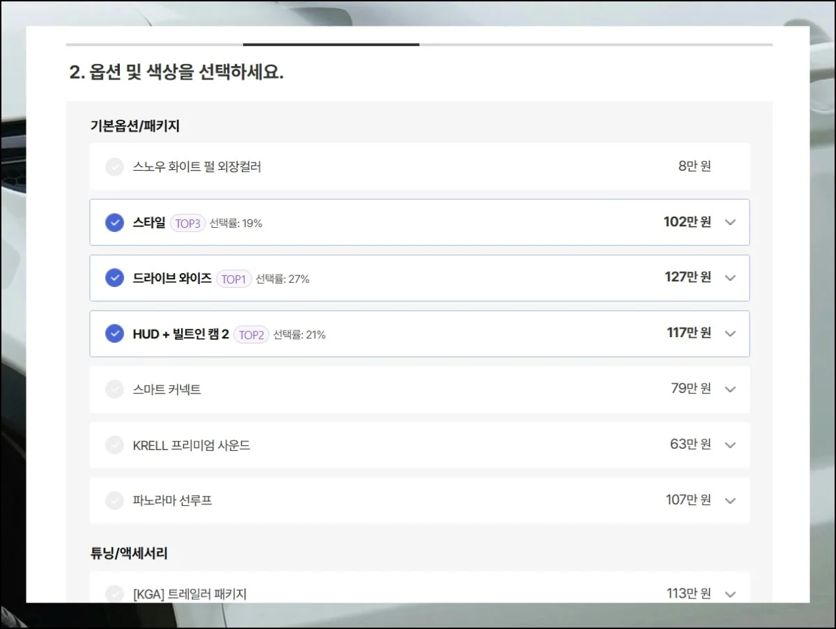 TOP 표시가 붙은 옵션들은 많은 분들이 선호하는 항목이에요. 이걸 참고하면 옵션 선택이 훨씬 수월해집니다.