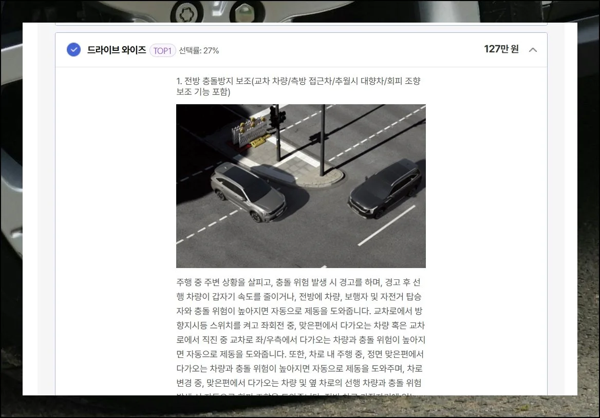 각 옵션의 구체적인 내용이 궁금하면 화살표를 클릭해보세요. 드라이브 와이즈 같은 안전 기능들을 자세히 알아볼 수 있습니다.
