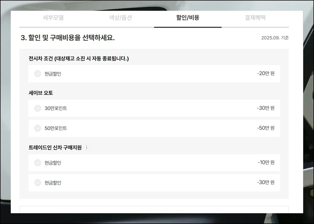 앞서 본 판매조건 중 본인에게 해당되는 항목을 체크하면 추가 할인을 받을 수 있어요. 차종별 가격표를 꼼꼼히 살펴보고 빠뜨리지 말고 선택하세요.