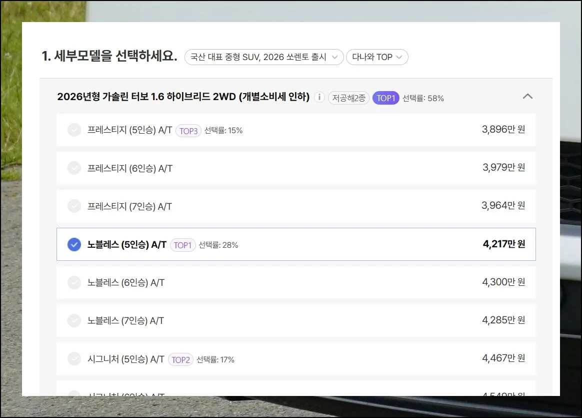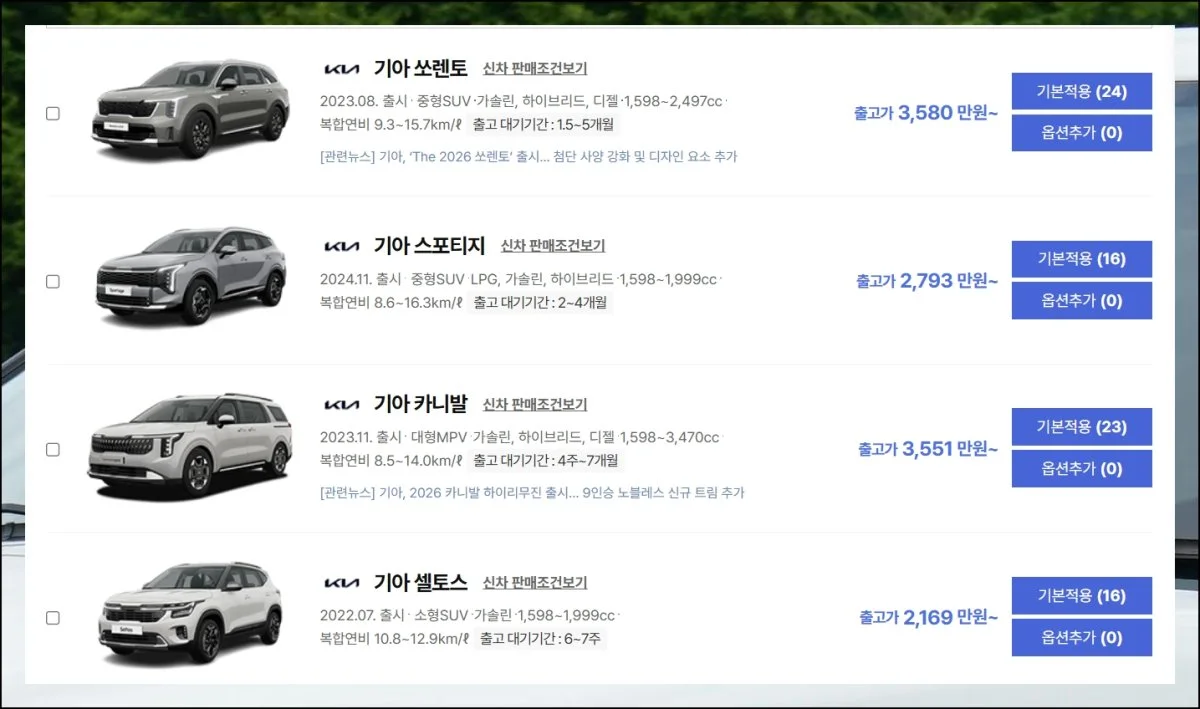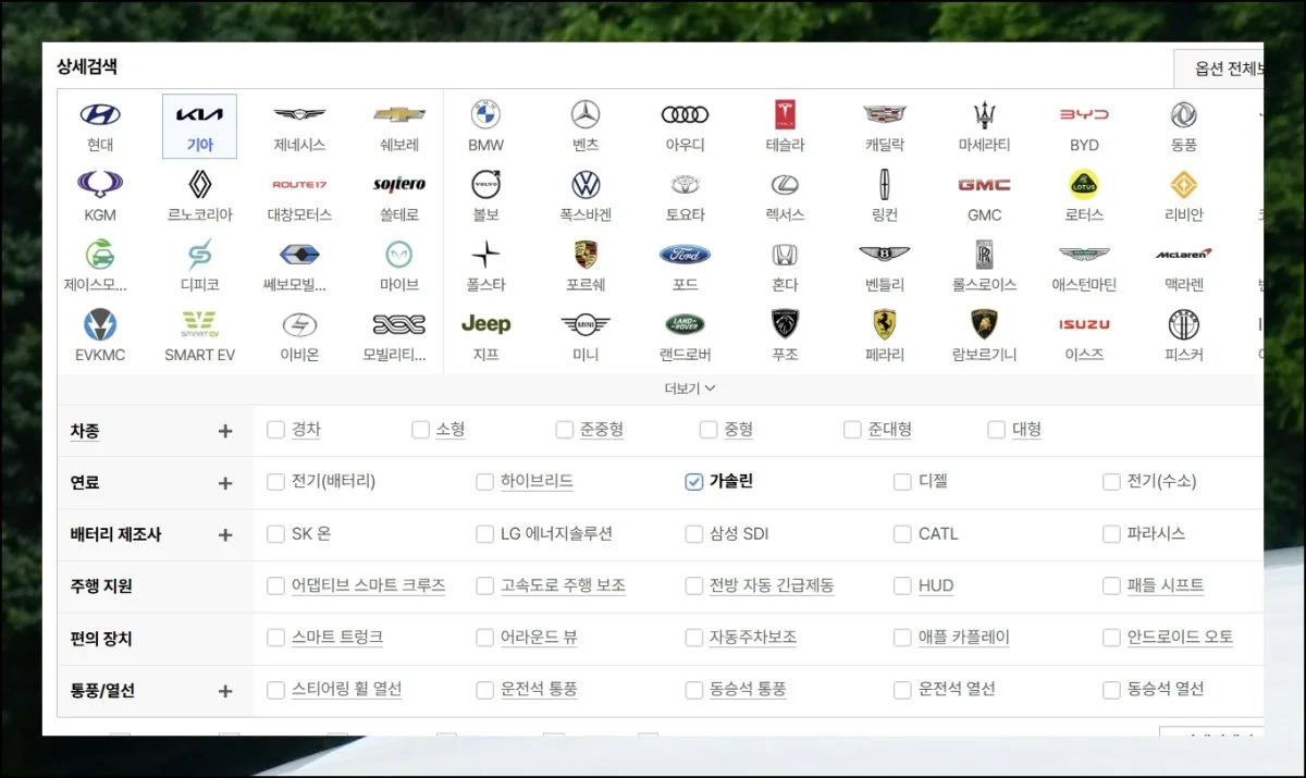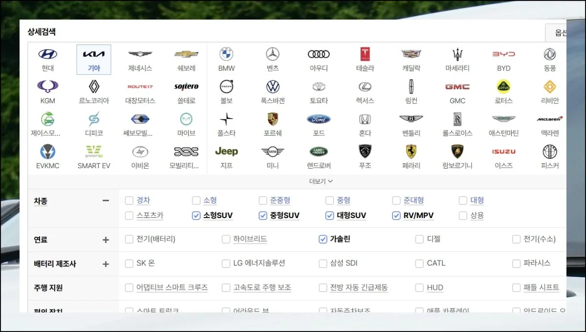 차종을 고를 때 연료 타입이나 편의장치 같은 세부 조건도 함께 설정할 수 있어요. 이번 가이드에서는 기아자동차 SUV를 중심으로 살펴볼 거지만, 본인이 원하는 모든 옵션을 체크하면 맞춤형 결과를 받을 수 있습니다.