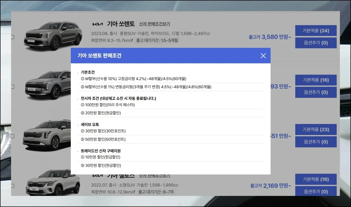 구매 전 기아 판매조건을 꼼꼼히 살펴보면 표시된 금액보다 더 저렴하게 살 수 있어요. 프로모션이나 전시차 할인 같은 다양한 혜택이 매달 새롭게 업데이트됩니다.