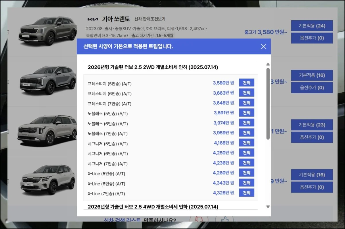 다나와 같은 사이트를 활용하면 최신 차종별 가격표를 무료로 볼 수 있어요. 기아 자동차의 실구매가는 수시로 변동되기 때문에 실시간 체크가 필수입니다.