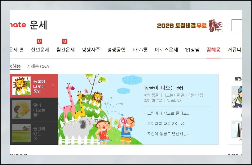 네이트 운세 섹션으로 이동하면 회원 등록이나 비용 지불 없이 사주 관련 항목을 무료로 받아볼 수 있습니다. 꿈해몽 메뉴를 선택하는 것만으로 즉시 이용이 가능해요.