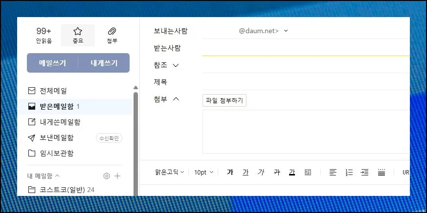 다음 사이트 로그인을 먼저 진행하세요. 메일 메뉴로 이동한 뒤 좌측의 “내게쓰기” 버튼을 클릭하면 됩니다.