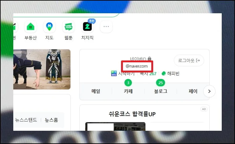 네이버 홈페이지 접속 후 로그인을 완료하세요. 화면 우측에 표시되는 프로필 정보를 살펴보면 됩니다.