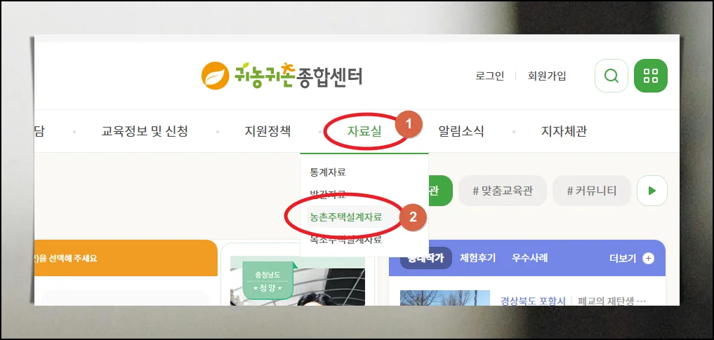 자료실에 들어간 다음에는 “농촌주택 설계자료”라는 세부 메뉴를 찾아서 선택하면 원하는 페이지로 넘어갈 수 있어요.