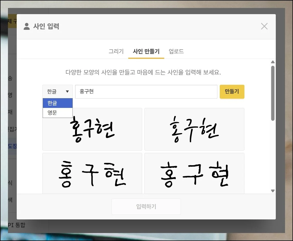 텍스트를 직접 입력하는 방법과 마우스로 그려서 작성하는 방법이 있습니다. 텍스트 입력 방식은 앞서 설명한 도장 제작과 절차가 똑같아요.