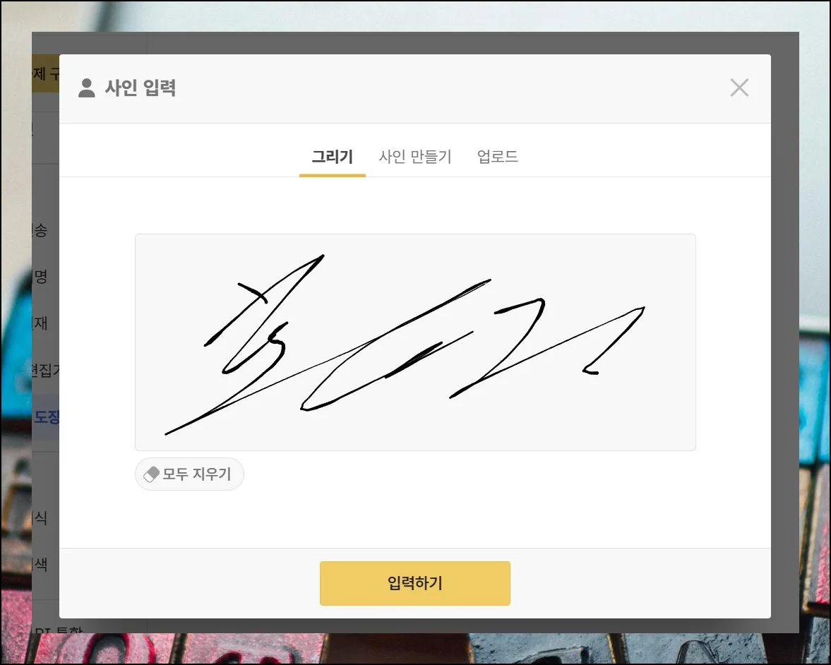 본인의 필체를 그대로 디지털로 옮길 수 있죠. 서명 작성을 마쳤다면 입력하기를 눌러주세요.