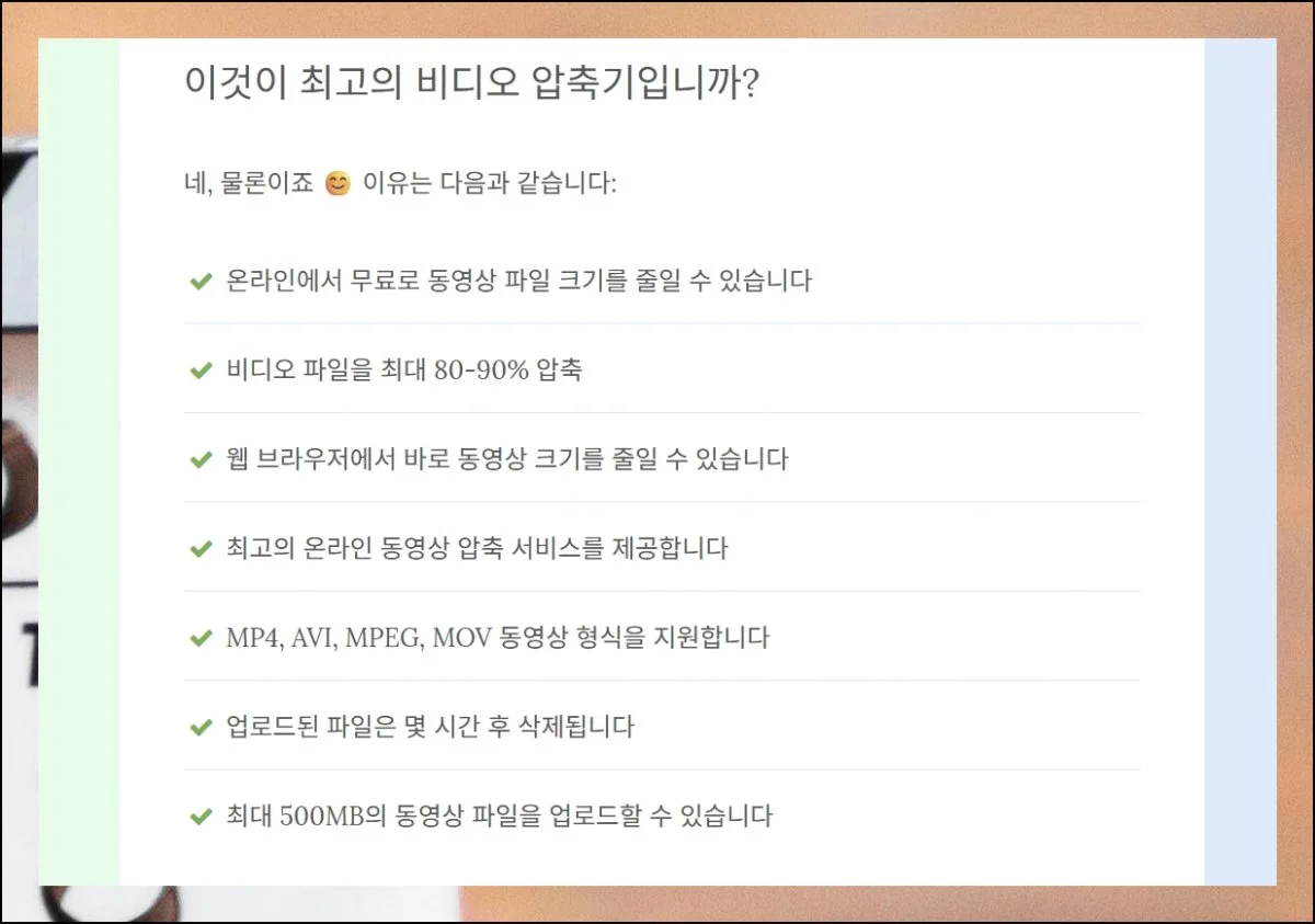 가장 큰 장점은 스마트폰 동영상 품질을 그대로 유지하면서 파일 사이즈만 최적화할 수 있다는 점이에요.