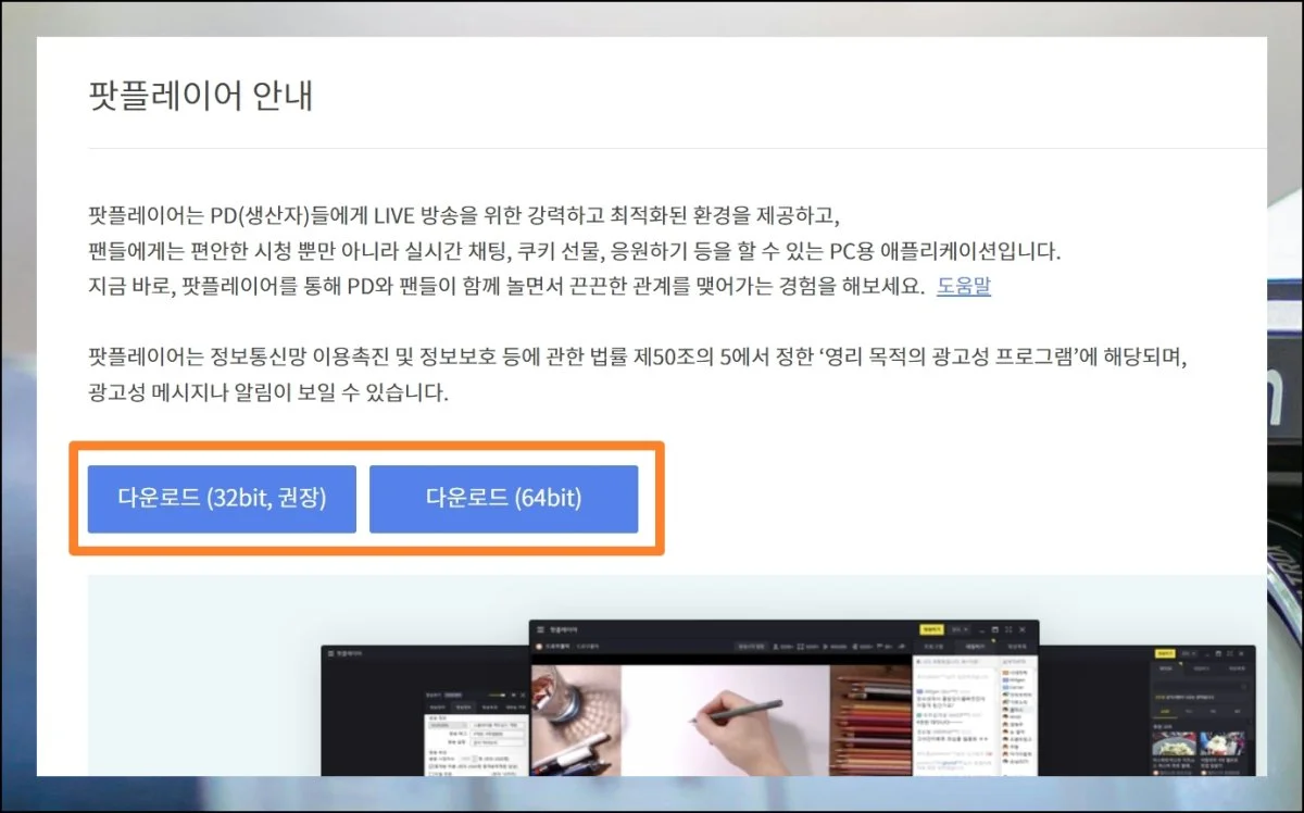 팟플레이어는 32비트 버전과 64비트 버전 두 가지로 나뉘어 있어요.