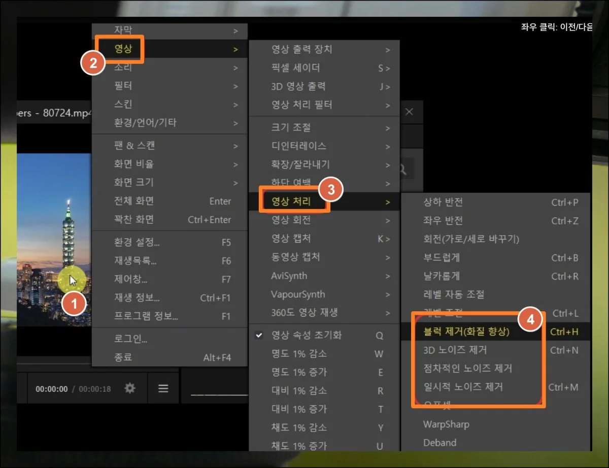 [블럭 제거], [3D 노이즈 제거], [점차적인 노이즈 제거], [오프셋]이 바로 화질 높이기 작업을 돕는 핵심 기능이에요.