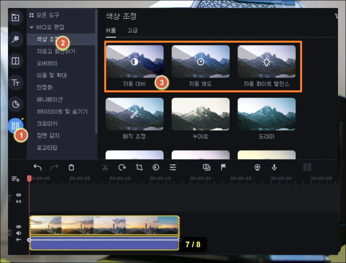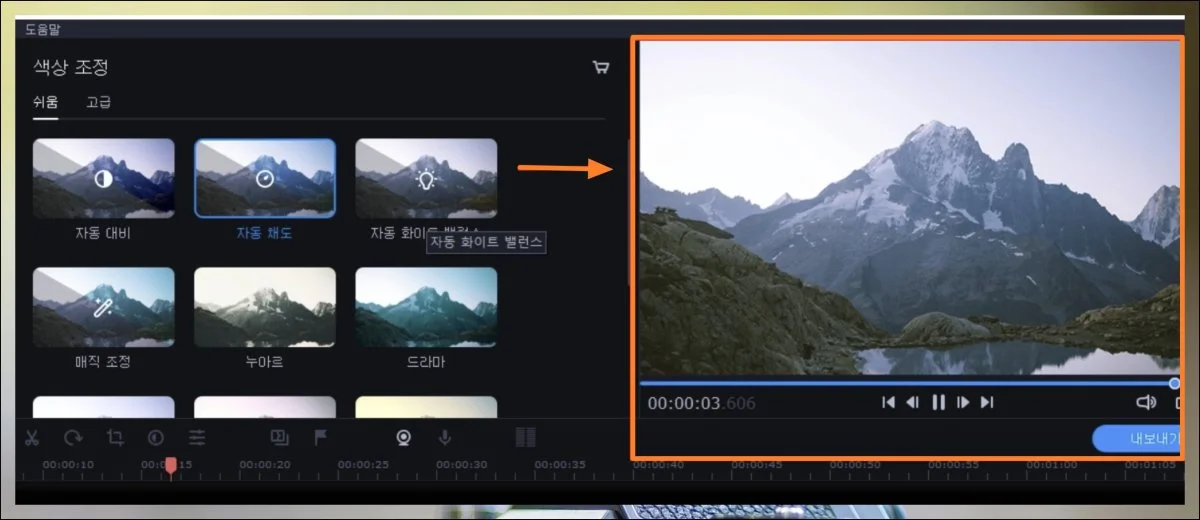 이 중에서 [색상 조절] 메뉴를 택하면 됩니다. [자동 대비], [자동 채도], [자동 화이트 밸런스]를 활용하면 동영상 품질을 크게 높이기 가능해요.