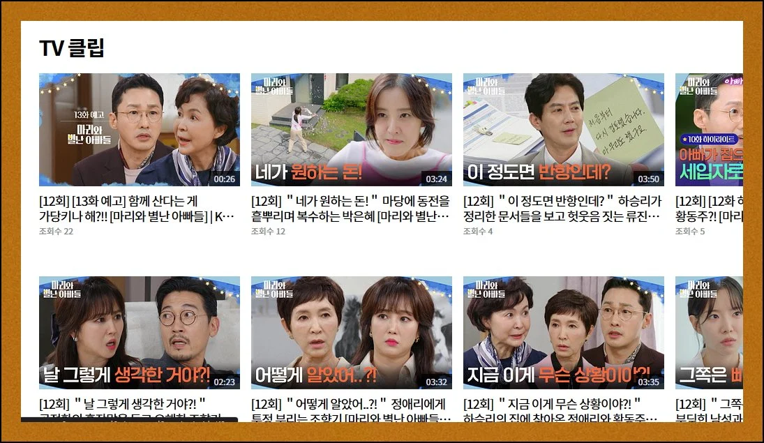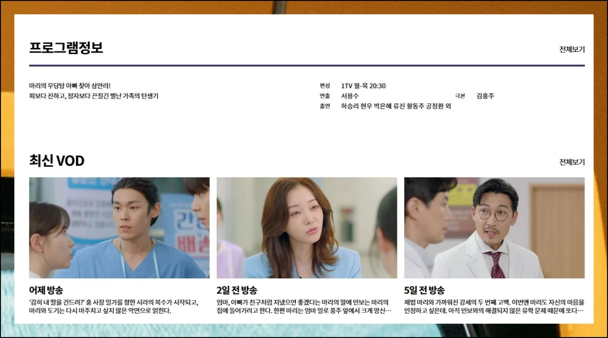 드라마의 각 회차에 대하여 간략한 줄거리가 제공되고, 방영 날짜도 함께 확인할 수 있어요. 시간이 부족할 때는 핵심 장면만 모아놓은 TV클립을 활용하면 좋습니다.