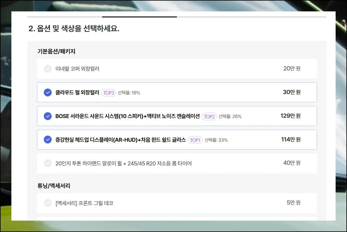 아직 구체적으로 정하지 못했다면 다른 구매자들이 많이 고르는 인기 옵션 위주로 골라보세요. 각 옵션의 자세한 설명이 궁금하시면 요금 옆 아래 화살표를 눌러보세요.