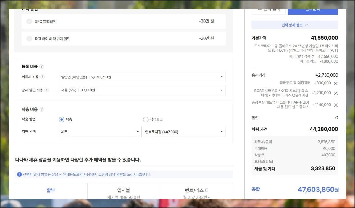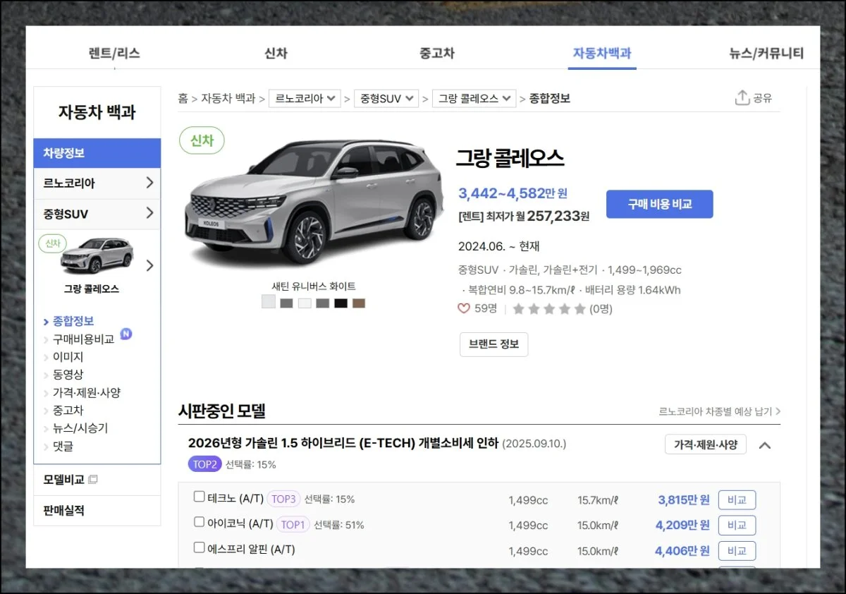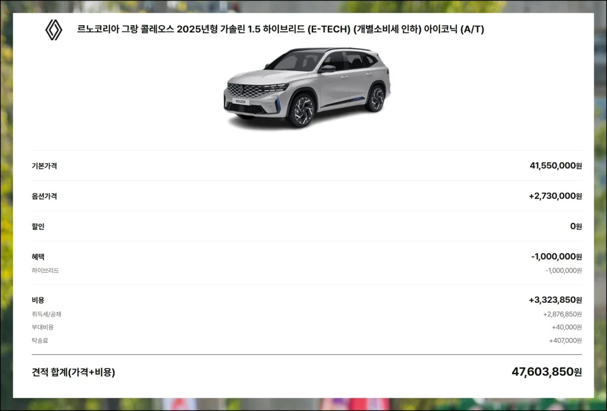 직접 확인한 내용을 알려드릴게요. 2025년형 르노삼성자동차 그랑 콜레오스 가솔린 1.5 하이브리드를 예시로 들어볼게요.