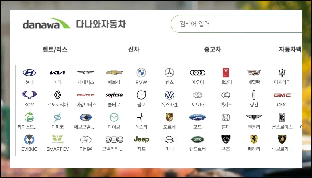다나와 사이트 첫 화면에 들어가면 주요 브랜드들이 쭉 보여요. 현대와 기아가 있고요. 제네시스도 나와 있습니다.