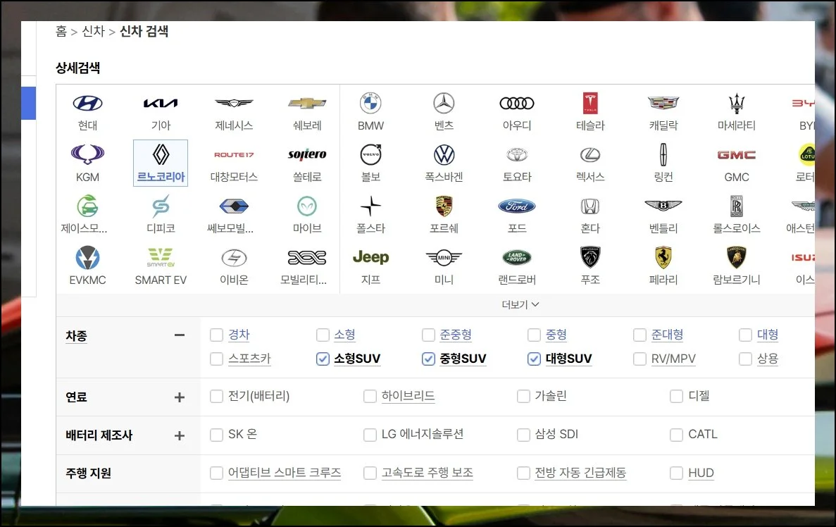 쉐보레와 BMW 같은 제조사들도 함께 보입니다. 여기서 르노코리아를 클릭하시면 됩니다.