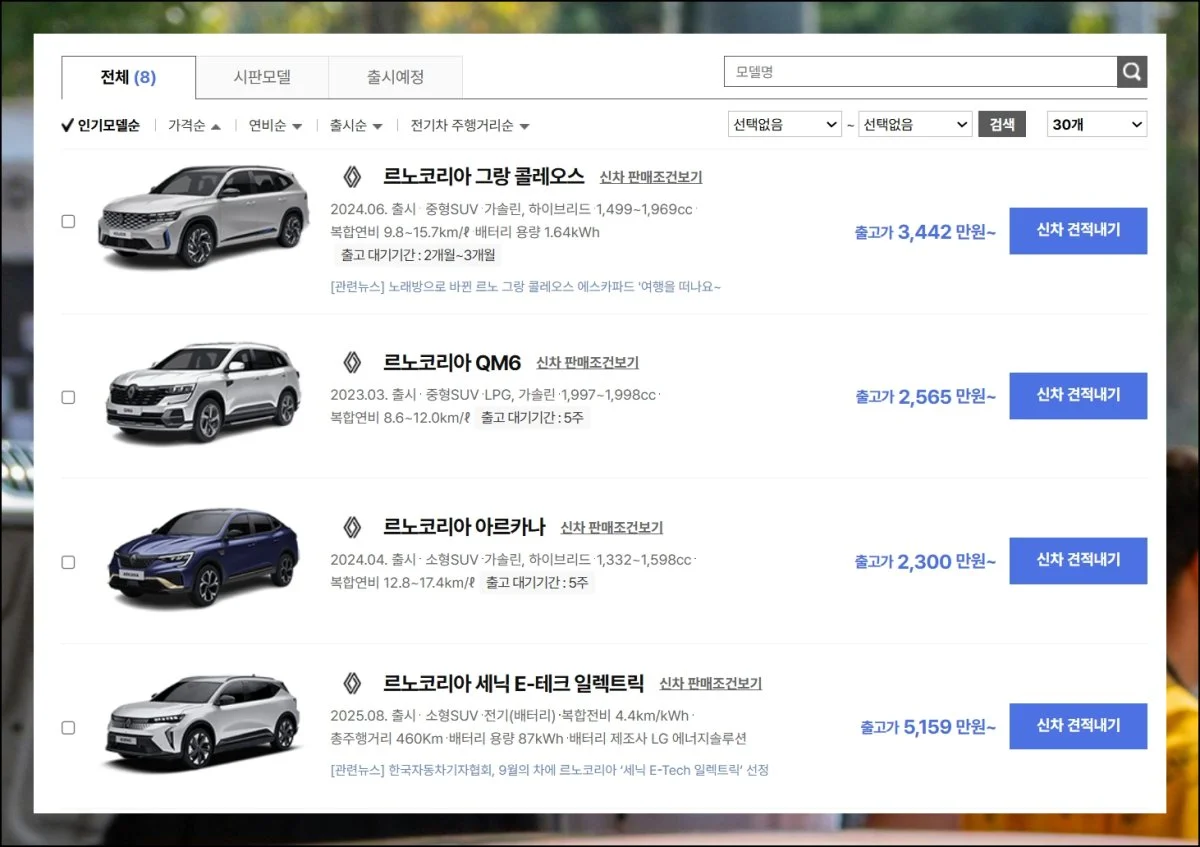 인기도 순서로 정렬된 목록을 살펴보세요. 그랑 콜레오스와 아르카나가 보이고요. QM6, 아르카나, 세닉 E-테크 일렉트릭 정보도 확인 가능해요.