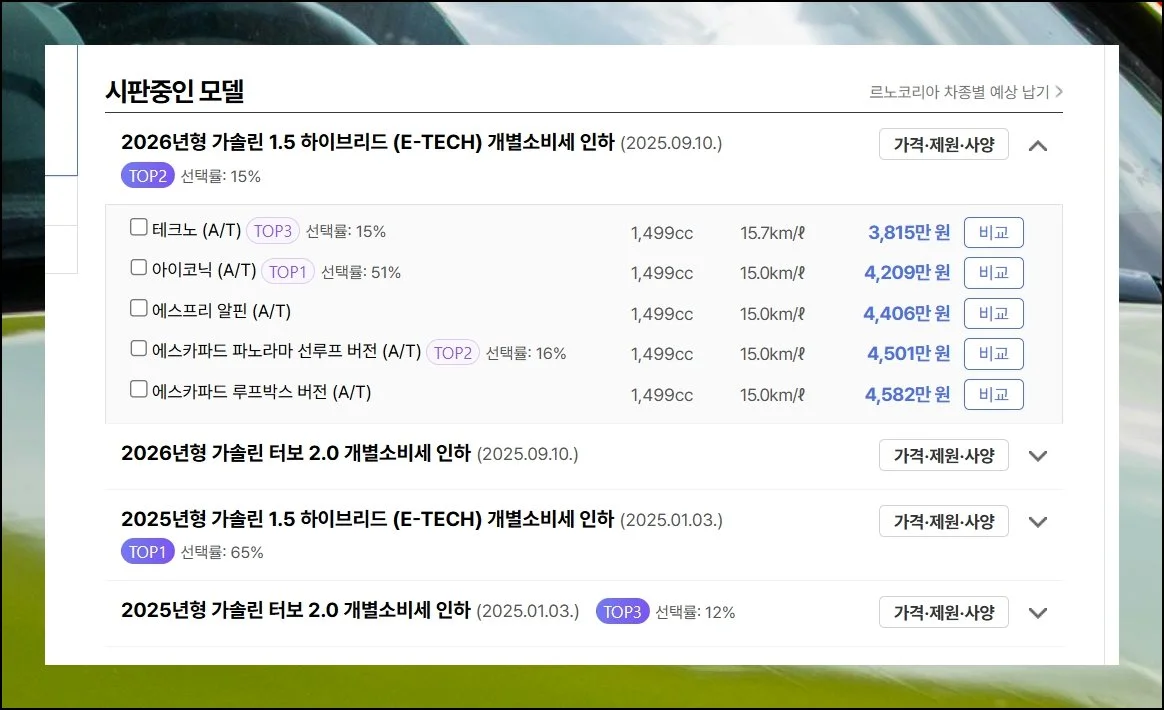 전문 비교 플랫폼을 이용하면 르노삼성자동차 신차가격표를 체계적으로 살펴볼 수 있습니다. 트림 선택부터 다양한 옵션 구성까지 직접 조합하면서 최종 금액을 확인할 수 있거든요.