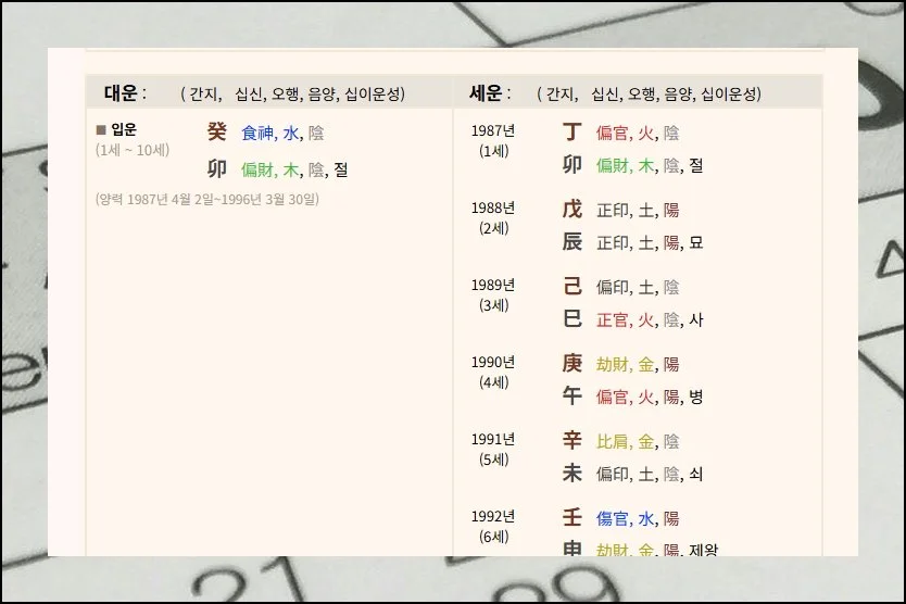 한자로 표기된 내용들 때문에 처음에는 어렵게 느껴질 수 있어요. 토정비결처럼 친절한 해석이 바로 나오지 않으니까요.