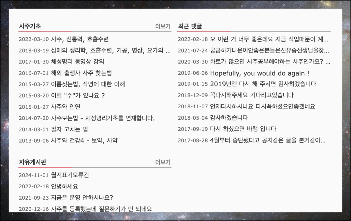 화면 하단의 기초 게시판에서 제공하는 무료 교육 자료를 차근차근 따라가다 보면 기본부터 사주보는방법을 익힐 수 있습니다. 물론 이러한 공부를 하지 않아도 만세력 서비스를 통해 자신의 운명을 살펴보는 것이 가능해요.