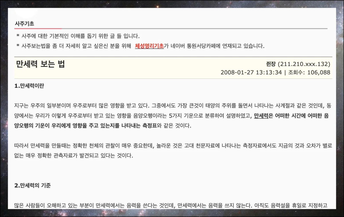 수많은 사용자들이 인정한 양질의 만세력 게시글들이 준비되어 있어요. 체성명리기초와 함께 살펴보시면 이해도가 훨씬 높아져요.