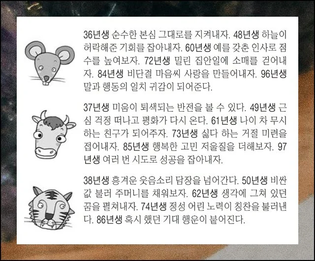 예를 들어볼게요. 72년생 쥐띠라면 사랑하는 이가 생겼을 때 고백을 들어보라고 조언해요. 이렇게 애정운도 함께 알아볼 수 있습니다.