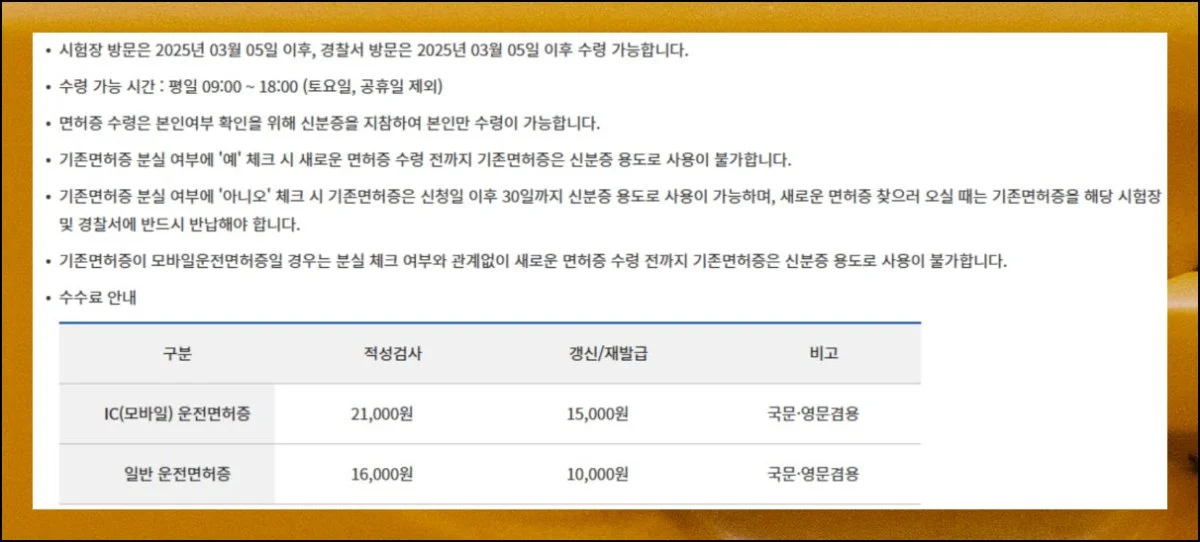 수령은 시험장이나 경찰서에서 가능합니다. 운영 시간은 평일 오전 아홉 시부터 오후 여섯 시까지예요.
