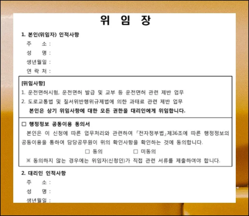 필요한 준비물은 신청자 본인의 신분증과 대리인 신분증입니다. 위임장 서류도 작성해서 가져가세요. 양식 작성이 어렵다면 제공되는 샘플을 활용하시면 됩니다.