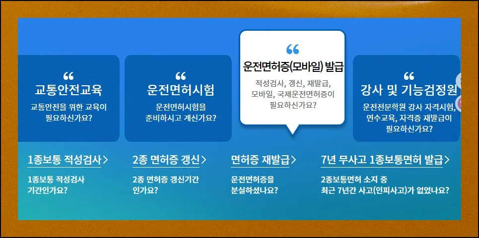기존에 도로교통공단에서 처리하던 일들이 전부 이곳으로 이관되었습니다. 분실 접수를 여기서 진행할 수 있어요. 각종 검사 관련 신청도 동일한 곳에서 처리됩니다.