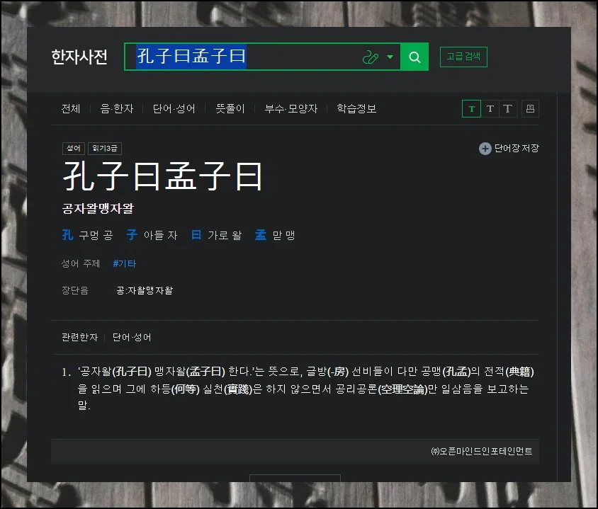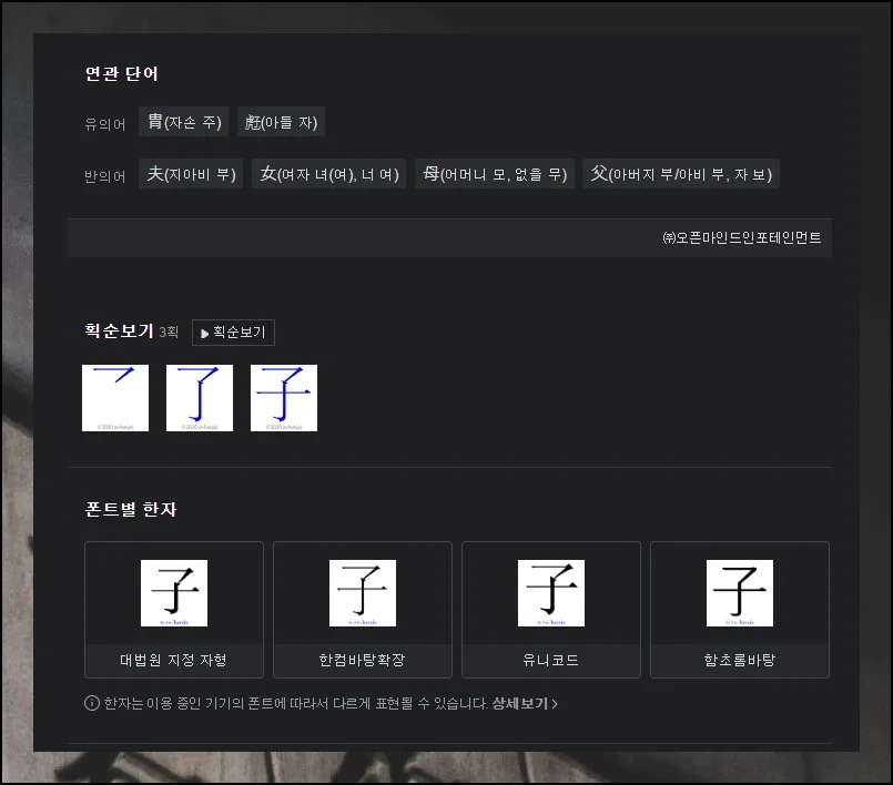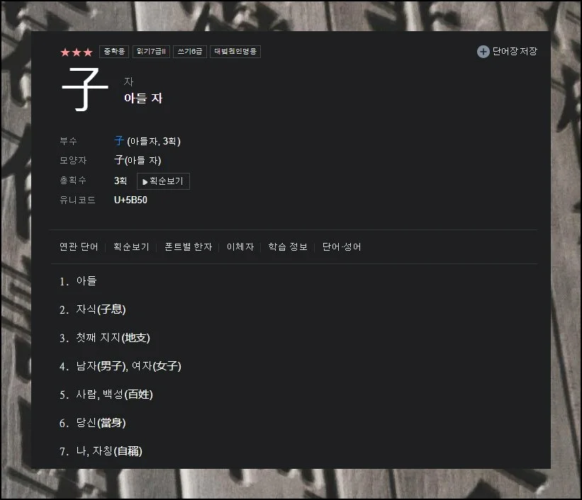 이번에 사용한 무료한문 번역기 서비스를 통해 한자의 사성음과 영문 표기까지 확인할 수 있어요. 관련 단어와 성어도 모두 살펴볼 수 있습니다. "아들 자"와 연결된 단어와 성어만 수천 개에 달하죠. 무료한문 번역기 중에서 가장 방대한 정보를 자랑하는 곳이에요.