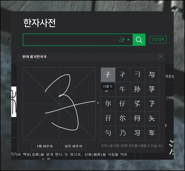 인식 화면이 뜨면 왼쪽 공간에 마우스로 글자를 그려보세요. 대략적인 형태만 그려도 충분해요. 오른쪽에 유사한 문자들이 자동으로 표시되니까요. 그중에서 찾으려던 것을 선택하면 끝입니다. 읽는 법을 전혀 모르는 한자도 이 방법으로 손쉽게 발견할 수 있어요.