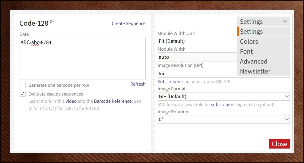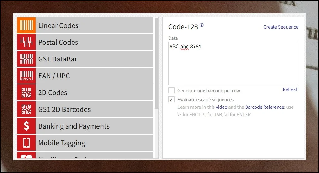식별 코드에 숫자뿐 아니라 문자도 같이 입력하는 방법이 있어요. LINEAR BARCODES 메뉴를 클릭해보세요. 다양한 선택지가 나타날 거예요.