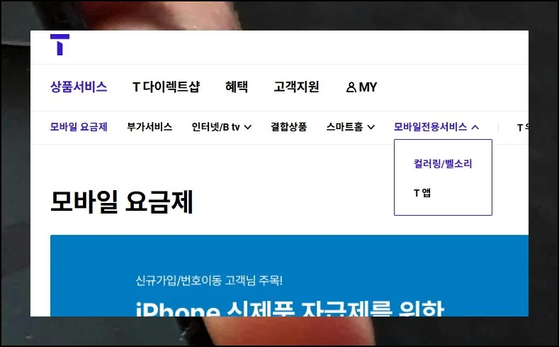 그러면 여러 메뉴가 나타나는데요. 이 중에서 모바일 전용 서비스를 선택하면 벨소리 관련 정보로 바로 연결됩니다.