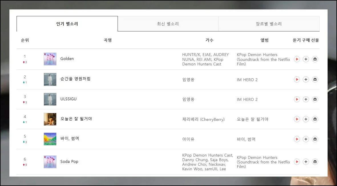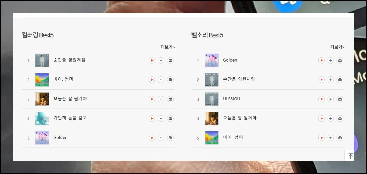임영웅님의 “순간을 영원처럼”과 “ULSSIGU”가 2, 3위에 올라 여전한 사랑을 받고 계시고, 체리베리의 “오늘은 참 탈까야”와 아이유의 “바이, 썸머”도 상위권에 자리하며 정말 다양한 음악들이 인기를 끌고 있네요.