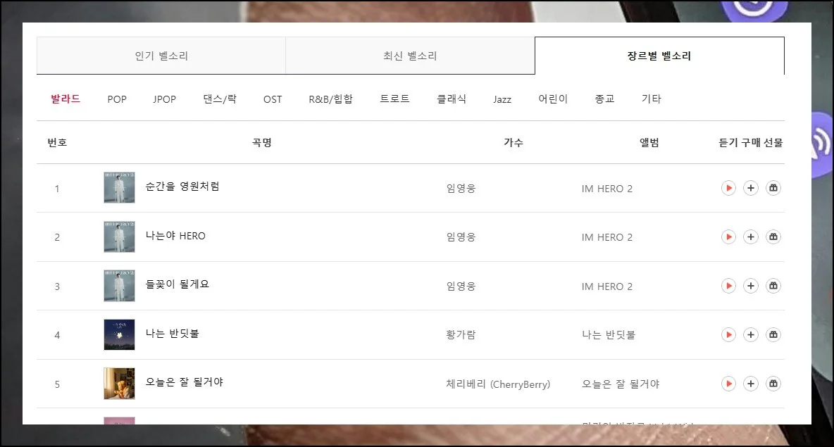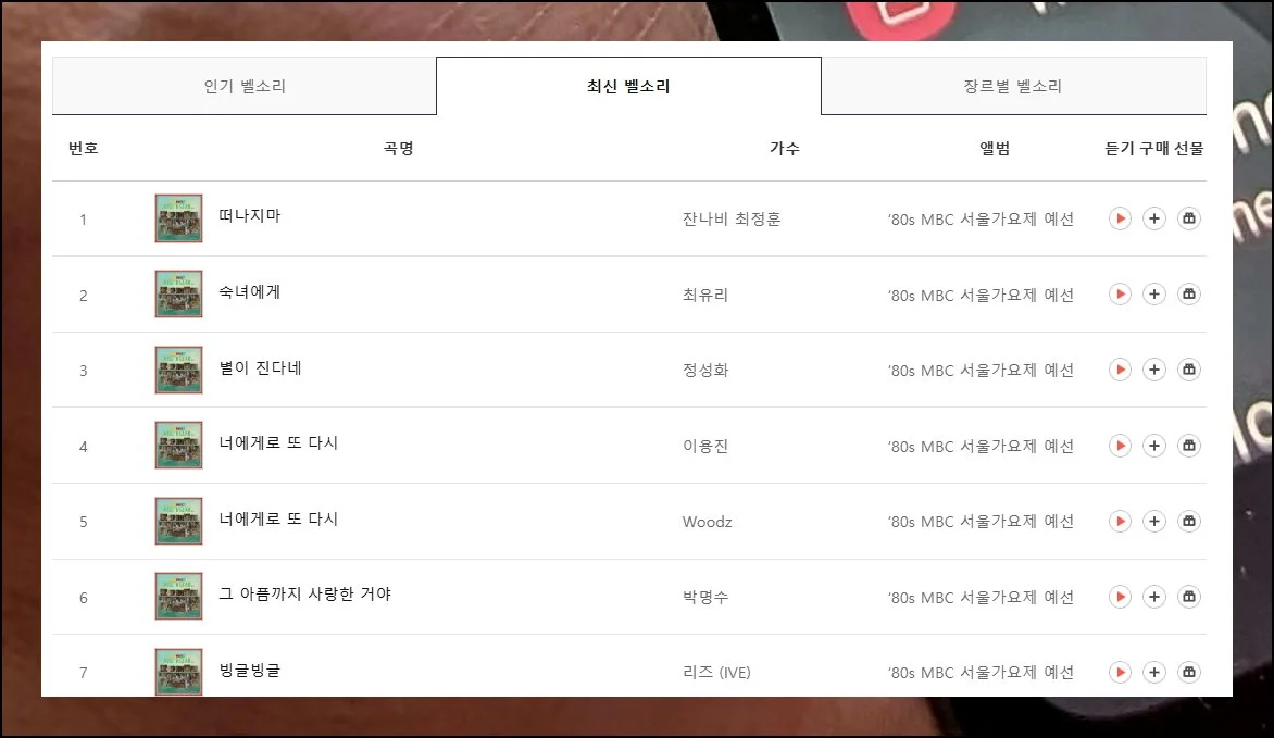 최신곡 카테고리는 출시 시기를 우선으로 정렬된 목록이에요. 대중성과는 별개로 새로 나온 음원들이 상위에 배치되니까 참고하세요.