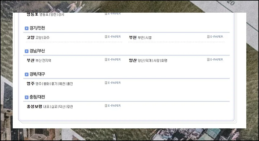 실제 종이 신문과 똑같은 형태로 제공되기 때문에 익숙한 방식으로 정보를 찾을 수 있어요. 지역별 설정부터 날짜 선택, 검색 기능까지 다양한 옵션이 준비되어 있습니다.