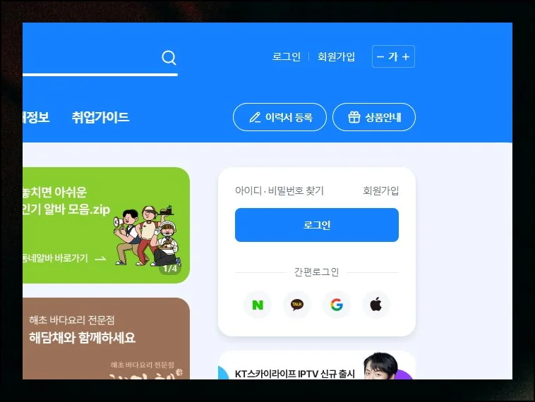 메인화면에서 “상품안내” 또는 ‘구인구직’ 메뉴를 클릭하면 별도의 전용 사이트로 연결됩니다.