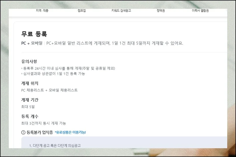 일일 1건 한정으로 무료 등록이 가능한데요. 공고는 최대 5일간 게재할 수 있다고 합니다.