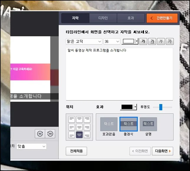 그러면 배치가 즉시 바뀝니다. 좌측 미리보기 창의 플레이 버튼을 눌러보세요. 최종 결과물이 어떤 모습일지 바로 체크할 수 있어요.